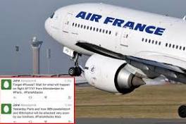Dapat Ancaman Bom, Pesawat Air France Mendarat di Amsterdam #ParisAttacks #isis," begitu bunyi ancaman di twitter mengacu kepada aksi teror di Paris dan insiden jatuhnya pesawat Metrojet Rusia di Sinai.