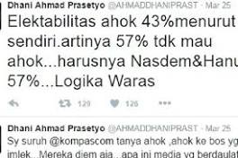 Cuitan 'Logika Waras' Ahmad Dhani di Twitter yang Bikin Geram Netizen Hal itu berdasarkan bocoran hasil survei sebagaimana disampaikan Dhani melalui akunnya pada Twitter @AHMADDHANIPRAST. Berdasarkan hasil ...